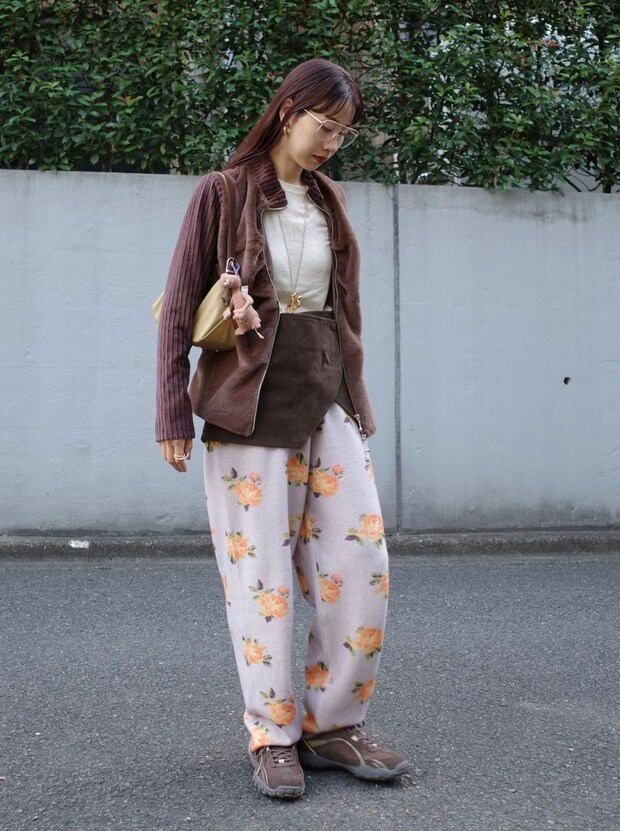 「ベストを羽織っているようなデザインのアウターは軽くて暖かく、お気に入りの一枚。アウターのブラウンをベースに、秋らしいカラートーンでコーディネートしました。渋くなり過ぎないよう、パンツの花柄をアクセントにまとめたのもポイントです」