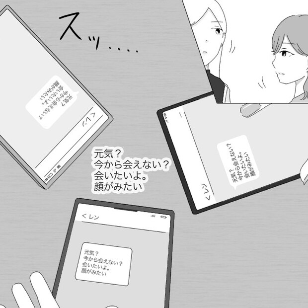 すると、カナコとモカはお互いに合図を送るように目を合わせて頷き、スマホの画面を見せてくれました。私たちに届いたメッセージの差出人は、レンでした。3人のスマホには「元気?今から会えない?会いたいよ、顔が見たい」と全く同じ文章が並んでいました。