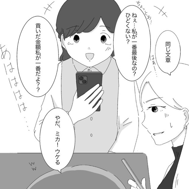 引っ込み思案なミカさんは、大学のインカレサークルでレンさんと出会います。距離を縮めて告白するも過去の恋愛を理由に「一番好きだけど付き合えない」とフラれてしまいますが、想い続けていれば彼女になれるはず、と曖昧な関係を続けました。それから時が経ち、ミカさんは社会人に、レンさんは大学を中退して遊び歩く毎日。それでもミカさんはレンさんを信じて、スーツを買ったり食事をご馳走したりして支えていました。しかしある日アツシさんから、レンさんにとって自分は都合のいい女であることを知らされます。信じたくないミカさんはレンさんにメッセージを送りますが、返信どころか既読にもなりませんでした。連絡がつかないまま2週間が過ぎた頃、アツシさんから「レンがバスケに来る」という情報を仕入れます。仕事終わりに体育館に行くと、レンさんの隣には知らない女性の姿が。ミカさんは自分が今まで騙されていたことを悟りました。翌日、心身ともに疲労して会社を休んだミカさんは、コンビニでバスケサークルにいた2人の女性と遭遇します。昨日の辛い出来事を思い出して泣き出すミカさんを、2人は優しく介抱してくれました。それからというもの、カナコさんとモカさんは、ミカさんが寂しくないようにいつも連絡をくれるようになりました。もうすっかり友達になった3人。いつの間にかミカさんの失恋の傷はすっかり癒えていました。それからしばらく経ったある日、いつものようにカフェで女子トークを楽しんでいたミカさんたち。すると、カナコさんのスマホに1件の通知が届きました。カナコさんはスマホの画面を見るなり、「うわっ」と低い声で言いました。すると、次はモカさんのスマホに通知が届きました。一向に何も話さない2人を見てやきもきしていると、今度はミカさんのスマホが鳴りました。表示された画面を見て、思わず顔を青ざめます。