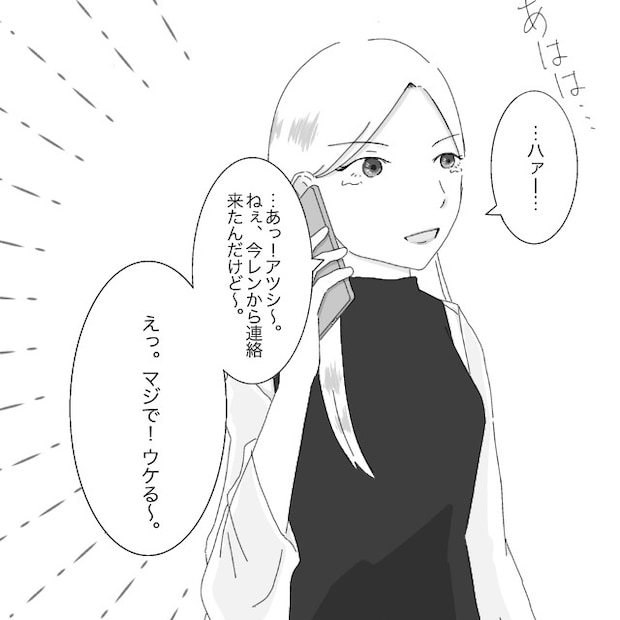 3人でお腹がよじれるほど笑ったあと、カナコがおもむろにスマホを手に取り、レンの友達のアツシくんに連絡しました。「あ、アツシ~今レンから連絡来たんだけど・・・えっ、マジで!ウケる~」と何やら楽しそうに話しています。
