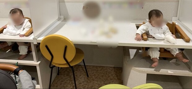 席がとても広く、わが子と向き合ってご飯を食べられる席。これは、子連れにはうれしい座席ですよね。これなら周りの目を気にすることなく、ゆっくりと食事が楽しめそう。離乳食期の子に食事を与えながらママやパパがごはんを食べるのにも適しているように見えます。