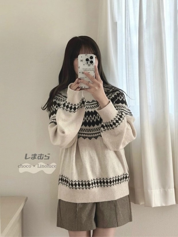 寒さが深まると着たくなる、ノルディック柄のニット。編み込まれた模様が目を引くので、無地のボトムスと合わせるだけでコーデが完成しますよ♡