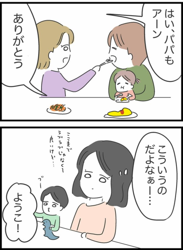 ちょっと早く着いてしまったようこは、近くに座っていた家族が目に留まりました。妻がゆっくり食べれるように旦那さんが子どもを抱いてくれている様子でした。こういう少しの気遣いでいいのに…。と羨ましい目で見つめるようこ。