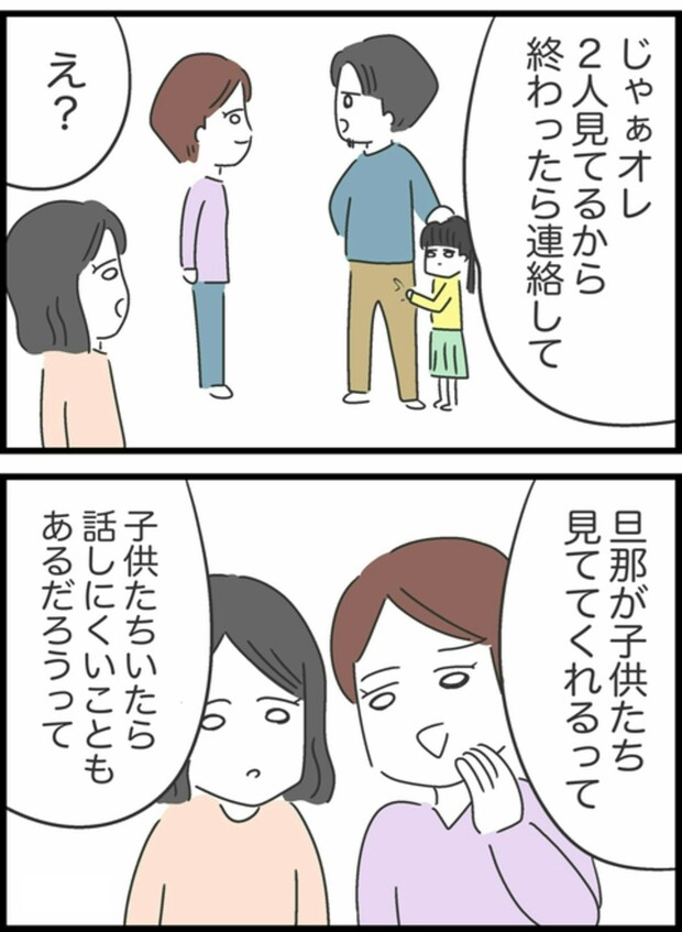 ファミレスで約束していた友人と待ち合わせたようこ。「久しぶりー」と現れた友人は夫と子どもを連れていました。すると友人の夫が「じゃぁオレ2人見てるから」と言い出し…。