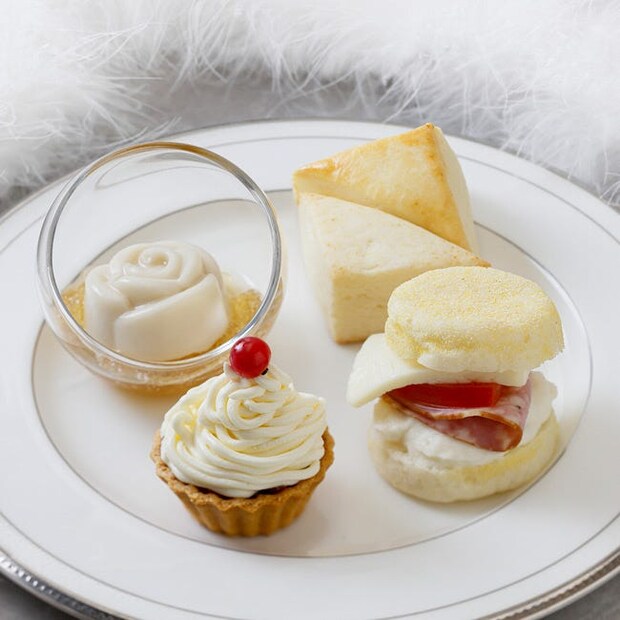 下段に並ぶのは、白薔薇を思わせる「蕪のブランマンジェ」や、モンブラン仕立ての「スモークサーモンのタルタル」、ミニサイズでかわいらしい「カプレーゼ風マフィンサンド」など、遊び心と可憐さを兼ね備えたセイボリー。ホワイトカラーに統一されたラインナップは、見た目でも楽しめる上品な華やかさ。