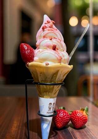 「パリっといちごソフト」テイクアウト価格1,180円(税込)・イートイン価格1,202円(税込)は、カルピジャーニを使ったなめらかな舌触りのソフトクリームに、いちごチョコを網目状にコーティングして、ドライいちごをまぶしたパリッと食感が魅力。コーンの底まで楽しめる染みチョコもポイントだ。