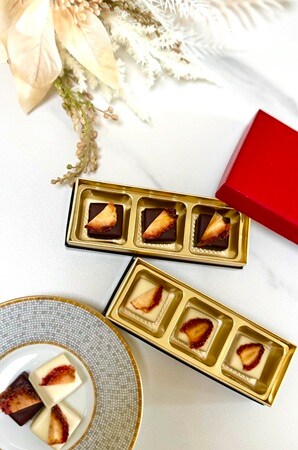 ドライいちごがトッピングされた、新作「三ツ間農園ボンボンショコラ」1980円(税込)も個数限定で販売。