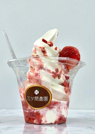 「ゴロっといちごサンデー」テイクアウト価格1,280円(税込)・イートイン価格1,304円(税込)は、カルピジャーニを使ったソフトクリームに三ツ間農園のいちごをすり潰した、着色料、保存料、砂糖無添加のピューレをたっぷりかけて、フリーズドライいちごをまぶしている。トップには冷凍いちごを丸々一つ添えた、濃厚ソフトと純粋ないちごの酸味がたまらない一品だ。