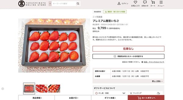 「プレミアム贈答いちご」は11月5日(水)より受注を開始しており、上限に達し次第受注終了。到着期間は12月11日(木)以降、日付の指定は不可となっている。