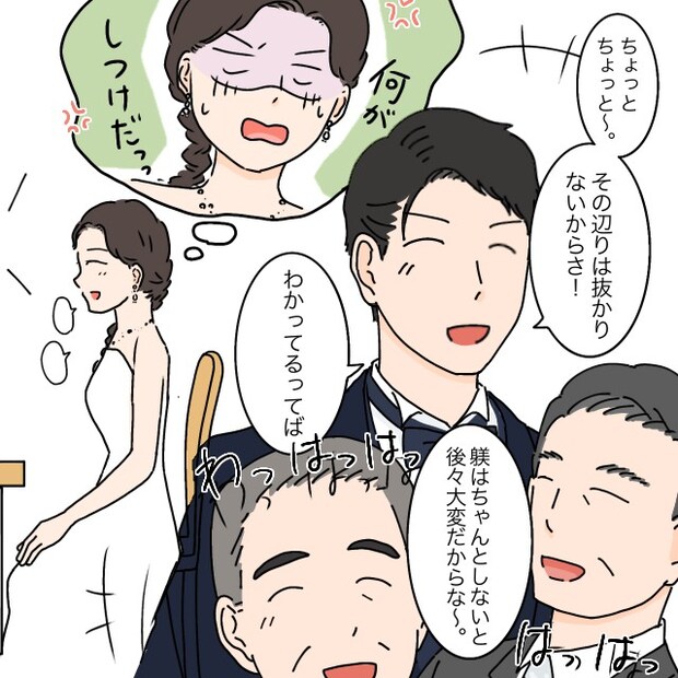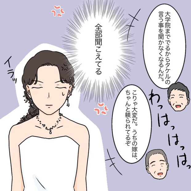 義父は「大学院まで出るからタケルの言うことを聞かなくなるんだ。」と学歴を小馬鹿にし、「こりゃ大変だ。うちの嫁は、ちゃんと躾けられてるぞ」と言う親戚と笑い話に。義父母の話は全部聞こえていて、静かに座っていながらも私はずっとイライラして居ました。披露宴なのに!