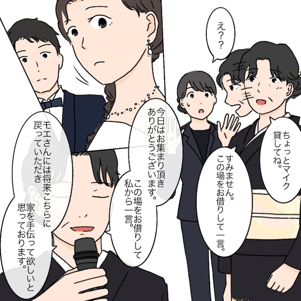 突然、義母が「ちょっとマイク貸してね」と、司会の女性が「え?」と動揺するのも気にせずマイクを取り上げました。そしてみんなの前で宣言したのです。「この場をお借りして私から一言。モエさんには将来こちらに戻っていただき、家を手伝ってほしいと思っております。」義母の話を聞いていた私は驚きました。そんな話、ひと言も聞いていません。