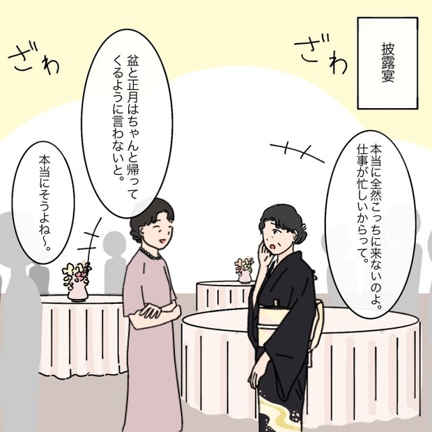 そして披露宴当日。義母は親戚に「本当に全然こっちに来ないのよ。仕事が忙しいからって。」とさっそく愚痴をこぼしていました。