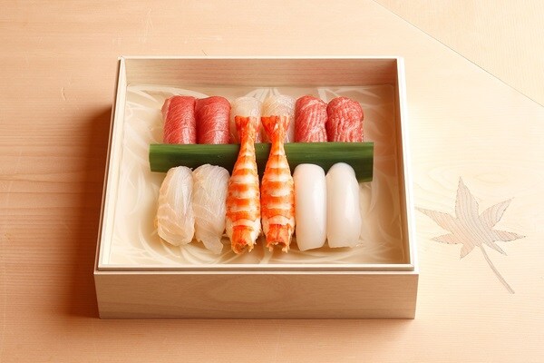 豊洲の有名仲卸「やま幸」の本マグロ(赤身、中トロ、大トロ)をはじめ、「鮨 銀座おのでら」でも人気の「自家製小肌」、「自家製煮穴子」など贅を尽くした全24貫が新春の食卓を彩る。