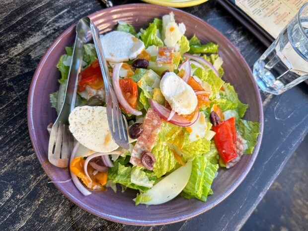 サラダは具材たっぷりで食べ応えがあり、ピザ生地は薄めながらももちもちとした噛みごたえが楽しめます。