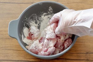 2. 下味のついた鶏もも肉に薄力粉をまぶしてもみこみます。