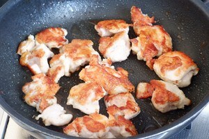 3. フライパンに油を熱し、2の鶏肉をこんがり焼きます。