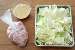 1. 鶏もも肉は一口大に切ってポリ袋に入れ、下味の酒をもみこんでおきます。キャベツは大きめのざく切りにして、たれの材料はあらかじめ混ぜ合わせておきましょう。