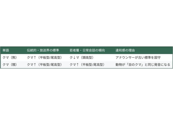 「動物」と「目のクマ」の区別が失われ、伝統と若者の新しい標準が衝突この違和感の最大の原因は、日本語の伝統的なアクセントルールが崩壊しつつあることと、それが「クマ(熊)」と「クマ(目の隈)」という異なる単語の区別を失わせていることにあります。
