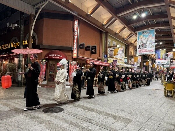 和楽器の演奏とともに、夜の大須商店街を練り歩く
