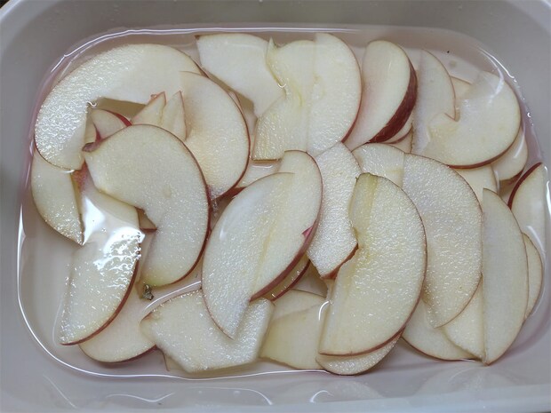 1. りんごは芯を取り除いて、皮ごと薄くスライスする。切ったらすぐに塩水(分量外)に浸ける。