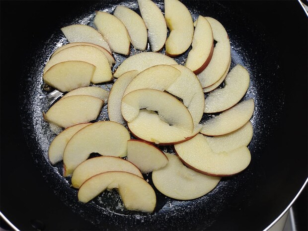 3. フライパンにサラダ油とバターを入れて熱する。バターが溶けたら1のりんごを並べる。