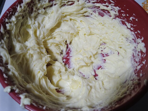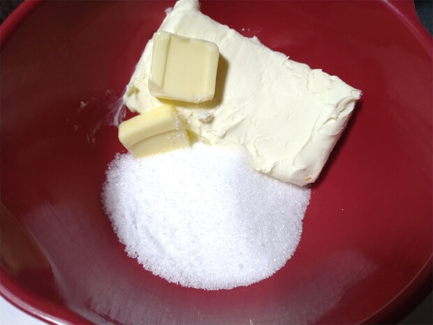 1. ボウルにグラニュー糖、クリームチーズ、バターを入れて混ぜる。