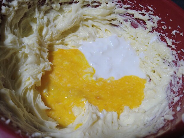 2. 1に溶いた卵とヨーグルトを入れて、さらに混ぜ合わせる。