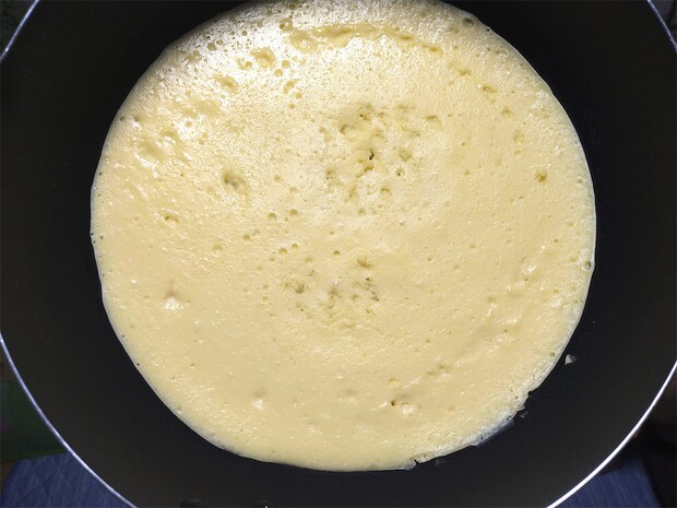 4. フライパンにサラダ油を加えて熱したら、生地を流し込む。弱火で6分ほど焼いて、表面が乾いてきたら火を止める。粗熱が取れるまでそのままにする。