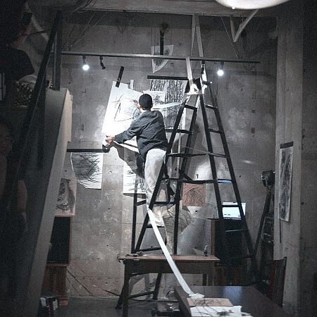 ソワレでは、hofli / TakashiTsuda氏の演奏とともに、ASUKI氏のドローイングがその場で生まれ、やがて消え、空間へと解き放たれていく。音と線が交差するプロセスそのものに立ち会う時間であり、マチネとは対照的に、痕跡としての絵画は残らない。