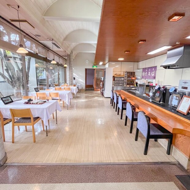 洋風なつくりのメインフロアにはテーブル席とカウンター席が並びます。