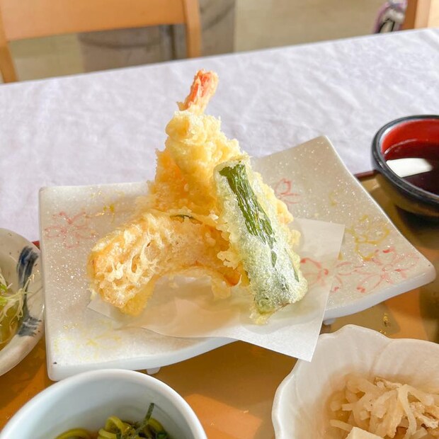 海老、かぼちゃ、ピーマン、鶏肉といったバラエティ豊富な内容の天ぷら。