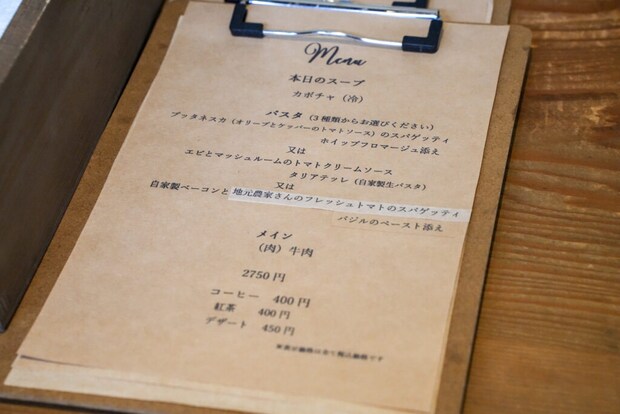 ランチメニューは「スープ・パスタ・メイン」の1コースのみ。