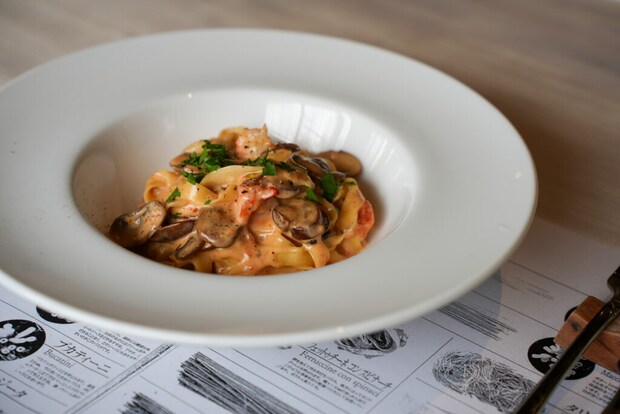 クリーミーなソースにきのこの香りがふんわり広がり、もっちりとした自家製の平麺がしっかりソースを受け止めます。