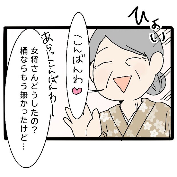「はい、でも・・・」と言いかけると、後ろから女将さんが「こんばんは」と顔を出します。急な女将さんの登場に驚いたのか、義母は「あらっ女将さんどうしたの?桶ならもう無かったけど・・・」と不思議そうに言いました。