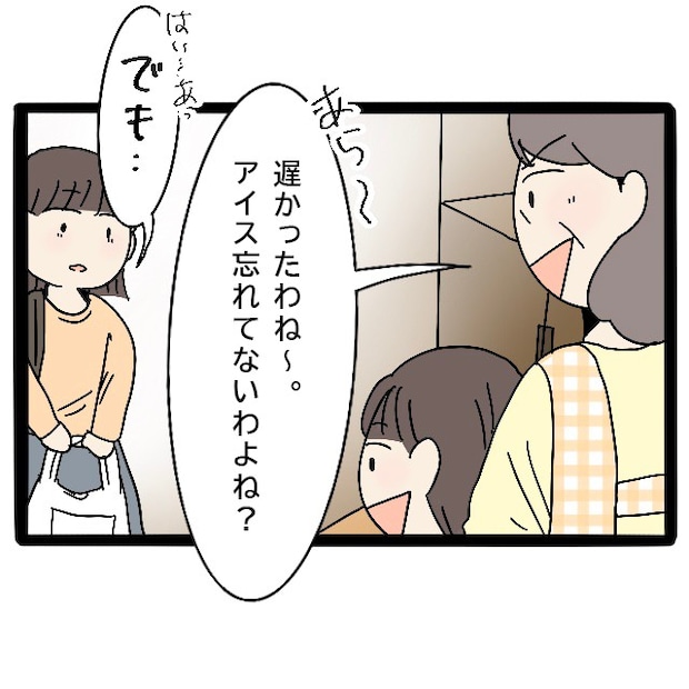 すると後ろから義母がやって来て、「あら~遅かったわね、アイス忘れてないわよね?」とニヤニヤしながら嫌味を言います。義母はきっとアイスが溶けたことを分かっていながら、あえて私に聞いているのでしょう。