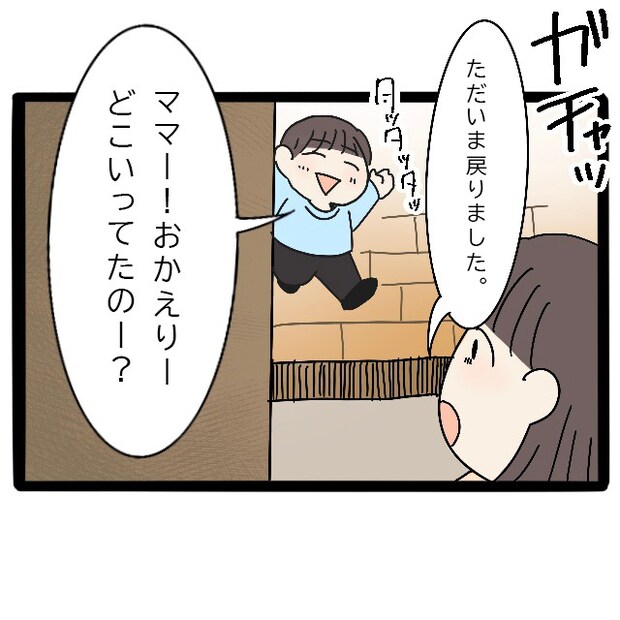 女将さんに義実家まで送ってもらい帰宅した私。「ただいま戻りました」と玄関を開けると、「ママー!おかえり、どこ行ってたの?」とダイが笑顔で出迎えてくれました。