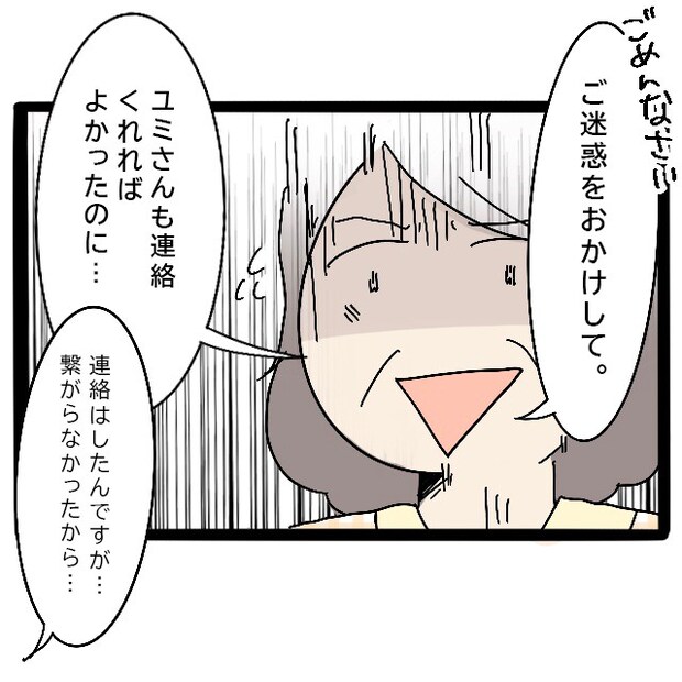 義母は慌てた様子で「ごめんなさい!ご迷惑をおかけして、ユミさんも連絡くれればよかったのに・・・」と、私が連絡をしなかったのが悪いかのように言いました。私は「連絡はしたんですが繋がらなかったから・・・」と言いました。