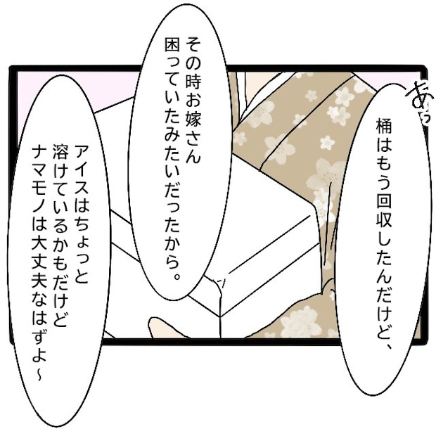 女将さんは「桶はもう回収したんだけど、その時お嫁さん困っていたみたいだったから・・・アイスはちょっと溶けているかもだけど、生ものは大丈夫なはずよ~」と言い、アイスと生ものが入った発泡スチロールを私の代わりに義母に渡してくれました。