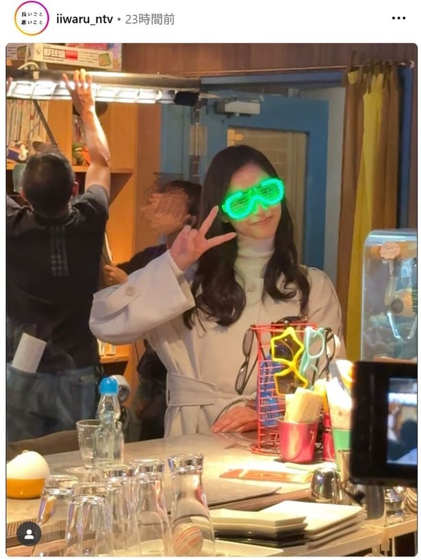 この日、公式Instagramは「昨日お見せしたメイキングのパリピ優子氏」などのコメントとともに、新木が緑色に光るメガネをかけてピースをする新木のオフショットを投稿した。