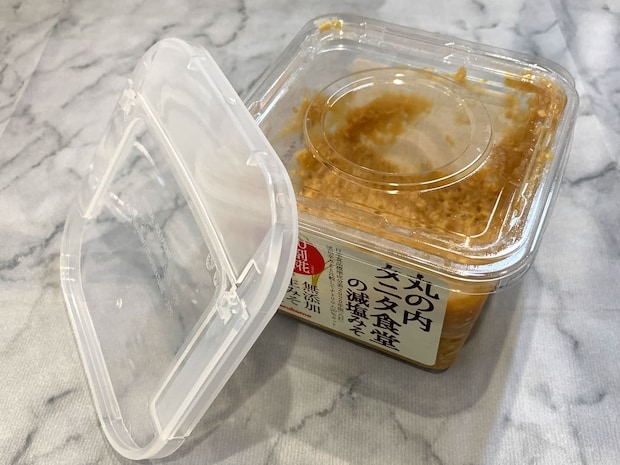市販の味噌はおおよそペラペラのシール式の蓋の上に、さらにプラスチック製の蓋を付けた商品が多いですよね。