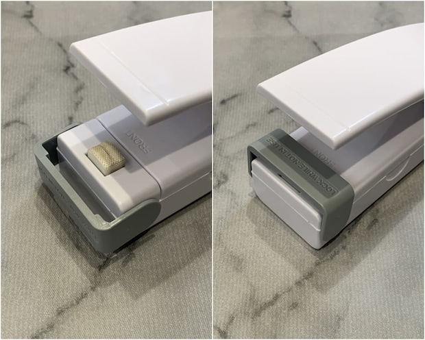 使い方は至ってシンプル!単3電池を入れたシーラーで開封済みの袋を挟み込み、スライドするだけです!