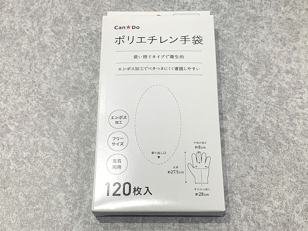 キャンドゥの「ポリエチレン手袋」は、120枚入りで110円という圧倒的なコスパが魅力。1枚1円以下なので、掃除や調理、衛生管理など様々なシーンで惜しみなく使えます。