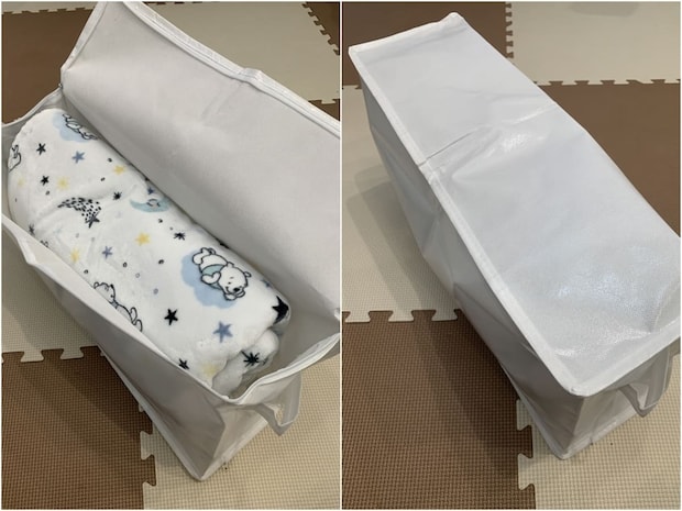 衣類・ぬいぐるみ・本などを整理できる収納バッグ!100均ながら容量のあるアイテム、ブランケットもコンパクトに収納できました!