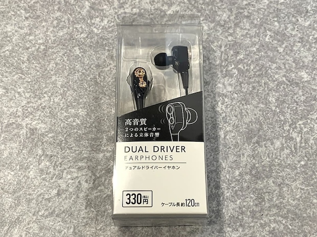 2つのスピーカーで立体音響を再現する「デュアルドライバーイヤホン」。330円という低価格ながら、内部のメカニカルなパーツが見える高級感あるデザインが魅力です。