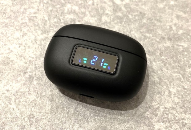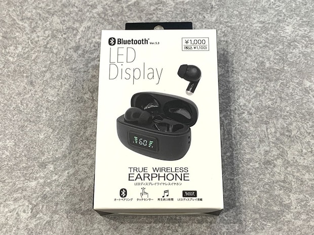 スタイリッシュなブラックのデザインが目を引く「LEDディスプレイワイヤレスイヤホン」。1,100円という破格の安さながら、ケースのディスプレイで充電残量が数値で細かく確認できる実用性の高さが魅力です。