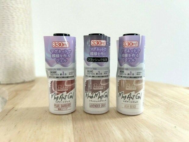SNSで話題のキャンドゥのマグネットジェルネイル「マグアートジェル」「微粒子マグ」「フラッシュマグ」の3種類です。