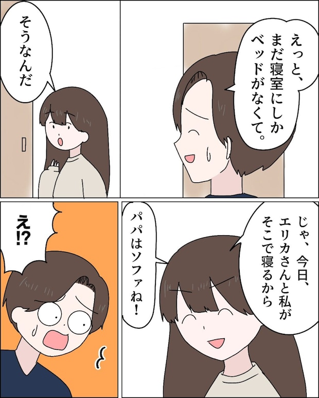 「えっと、まだ寝室にしかベッドがなくて」夫がそう言うと、「そうなんだ。じゃ、今日エリカさんと私がそこで寝るから。パパはソファね!」とジュリに言われ、「え!?」と夫は驚きました。