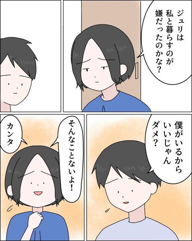 「ジュリは私と暮らすのが嫌だったのかな?落ち込む私に、「僕がいるからいいじゃん。ダメ?」と寂しそうに言うカンタ。私は「そんなことないよ!カンタ」と声をかけました。