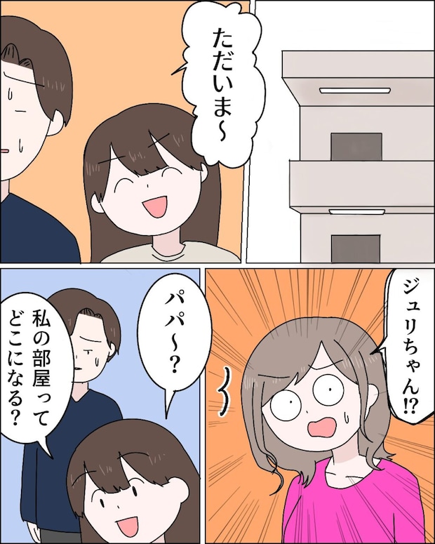 そして、夫とエリカさんのマンションに到着したジュリは、「ただいま」と声をかけると、「ジュリちゃん!?」とエリカさんがビックリ!「パパ~?私の部屋ってどこになる?」笑顔でたずねるジュリに、
