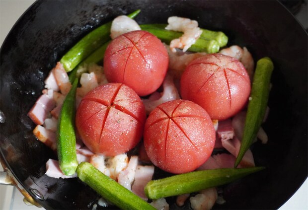おぉ、丸ごと使ったトマトやオクラがとっても豪快~。